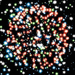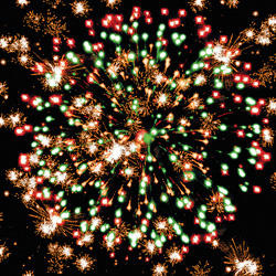 Разноцветные кометы разрываются сферами из золотых мерцающих, трещащих огней и крупных цветных огней.