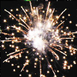 Красно-зеленая сфера (пион) и облако треска (трещащая хризантема). Фиолетово-зеленая мерцающая сфера (пион). Множество золотых ниспадающих нитей (парча) и белое мерцание. Разрыв фиолетовыми звездами с пышными хвостами (кокос) и облаком треска (трещащий дождь).