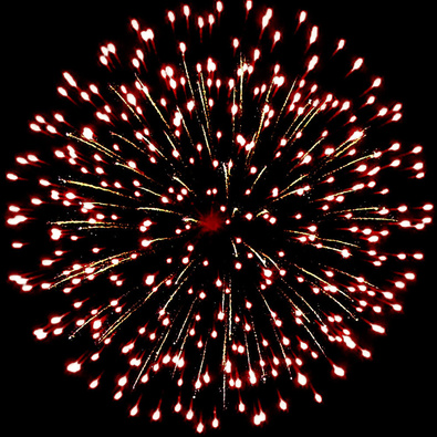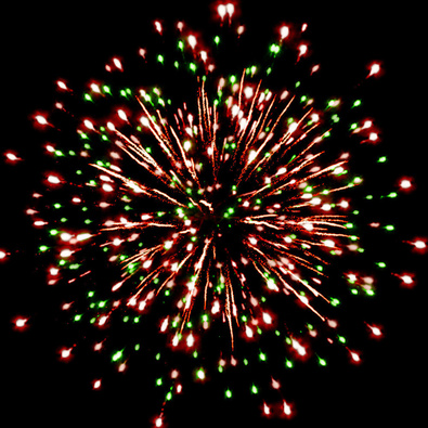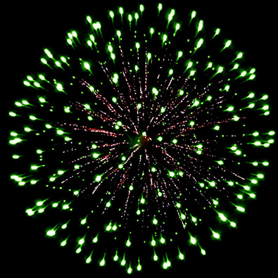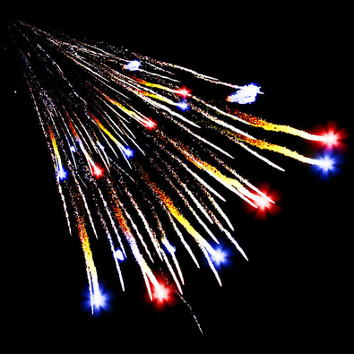 Разноцветные кометы, мерцающие трассы разрываются сферами из цветных огней с серебряными форсами в центре и трещащими искрами.