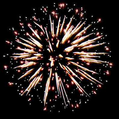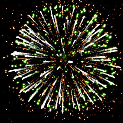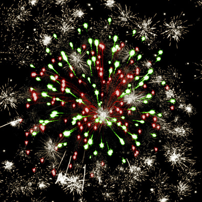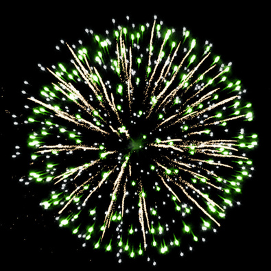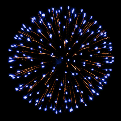 Разноцветные кометы, свистящие элементы разрываются сферами из: синих и золотых мерцающих огней; серебряных форсов с красными огнями на концах и белых мерцающих огней; серебряных форсов с зелеными огнями на концах и белых мерцающих огней; золотых форсов искристых и красных мерцающих огней; золотых искристых форсов, зеленых и белых мерцающих огней; золотых форсов и синих огней; множества трещащих сфер, красных и зеленых огней; золотых искристых форсов и белых мерцающих огней; серебряных форсов с красными - зелеными огнями на концах и золотых форсов с трещащими золотыми искрами.