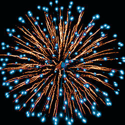Разноцветные кометы разрываются сферами из золотых и серебряных трещащих и искристых форсов и цветных мерцающих огней.