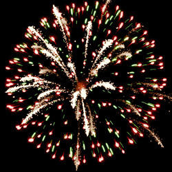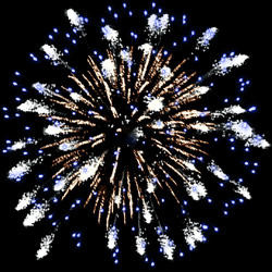 Разноцветные кометы разрываются сферами из золотых форсов, цветных огней с серебряными искрами и трещащих огней.