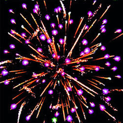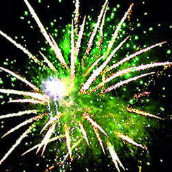 Зелено-желтая сфера (пион) и треск. Серебряные звезды с пышными хвостами (кокос) и зеленое мерцание. Мерцающие золотые хвосты (мерцающая ива) и фиолетовые звезды. Желтые звезды с пышными хвостами (кокос) и золотое мерцание. Серебряные звезды с пышными хвостами (кокос) и фиолетовые звезды. Желто-красная сфера (пион) и белое мерцание. Серебряные звезды с пышными хвостами (кокос) и синие звезды. Золотые звезды с пышными хвостами (кокос) и зеленое мерцание. Красные падающие букеты звезд (падающие листья) и трещащие букеты. Красочная концовка. ЗАЛП: красно-зелено-синие шуршащие разлетающиеся кометы (паучки).