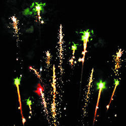 Красные звезды с пышными хвостами (кокос) и зеленое мерцание. Зеленые звезды с пышными хвостами (кокос) и золотое мерцание. Синие звезды с хвостами (волна) и треск. Фиолетовые звезды с хвостами (волна) и треск. Комета разрывается серебряными звездами с пышными хвостами (кокос) и облаком трещащих разрывов (трещащий дождь). Веер Z-формы: зеленые трещащие кометы и красные кометы с пышными хвостами. Веер: Свистящие змейки разрываются сферами золотых нитей с переходом в красно-зелено-синие звезды с треском (цветная трещащая хризантема). Веер: золотые трещащие разрывы. Красные звезды с пышными хвостами (кокос) и облако трещащих разрывов (трещащий дождь). Свистящие змейки разрываются зелено-фиолетовыми сферами (пион). Зеленые звезды с пышными хвостами (кокос) и облако трещащих разрывов (трещащий дождь). Свистящие змейки, облако трещащих разрывов (трещащая хризантема) и белое мерцание. Комета разрывается серебряными звездами с пышными хвостами (кокос) и облаком трещащих разрывов (трещащая хризантема). Свистящие змейки, красно-зелено-синяя сфера (пион) и облако трещащих разрывов (трещащая хризантема). 3 уровня. Веер: Внизу - красно-белое мерцание. Посередине - серебряные кометы с пышными хвостами. Вверху - белое мерцание. 2 уровня. Веер: Внизу - мерцающие букеты (бурак). Вверху - выстреливает подряд: Кометы разрываются желто-красной сферой (пион) и множеством серебряных ниспадающих нитей (парча). Зеленые и белые мерцающие букеты звезд (падающие листья).