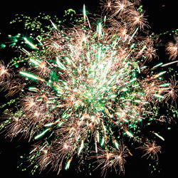 Разноцветные кометы разрываются сферами из цветных огней и множества трещащих сфер.