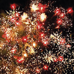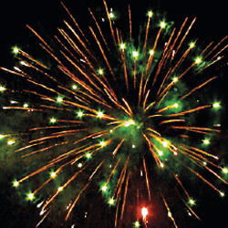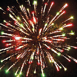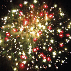 Разноцветные сферы и мерцающие разрывы переходят в белые хлопья. Цветные звезды с пышными хвостами. Свист. Множество золотых ниспадающих нитей.