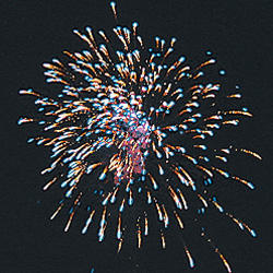 Разноцветные кометы разрываются сферами из золотых швермеров и цветных мерцающих огней.