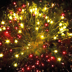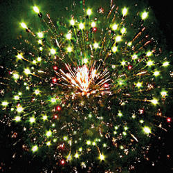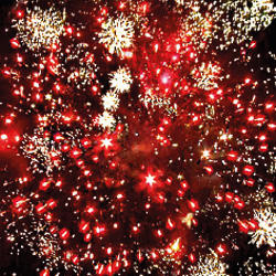 Цветная сфера, мерцающий разрыв переходит в белые хлопья. Разноцветные звезды с пышными хвостами. Множество золотых ниспадающих нитей. Облако треска.