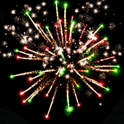 Разноцветные кометы разрываются сферами из: Золотых мерцающих огней и золотых искристых форсов. Золотых форсов, разлетающихся трещащих искр, красных и зеленых огней. Синих огней и золотых искристых форсов. Множества трещащих огней.