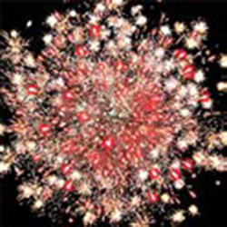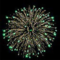 Разноцветные кометы разрываются сферами из крупных золотых и цветных мерцающих огней со множеством трещащих сфер, серебряных форсов.