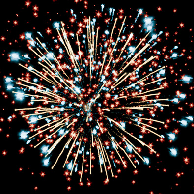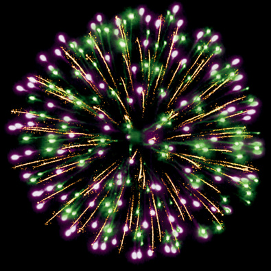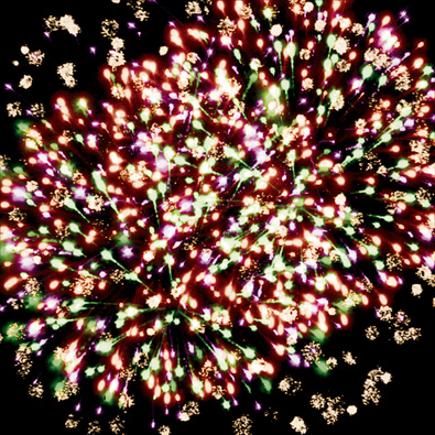 Разноцветные кометы разрываются сферами из золотых форсов с цветными искрами, множества трещащих сфер.