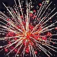 Красные звезды с белыми, золотыми хвостами, красным и белым мерцанием. Красные и синие мигающие звезды с белыми и золотыми хвостами, облако трещащих разрывов. Красочная концовка: залп из всех эффектов.