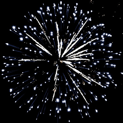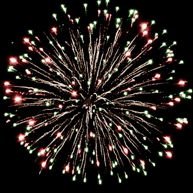 Разноцветные кометы разрываются сферами из серебряных форсов и цветных огней с множеством трещащих сфер.