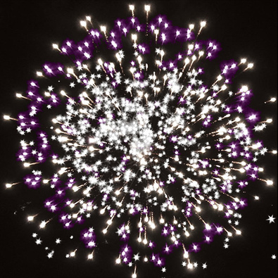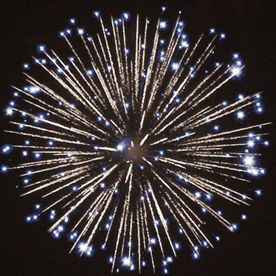 Разноцветные кометы разрываются сферами из цветных мерцающих огней, серебряных форсов и множества серебряных трещащих сфер.
