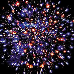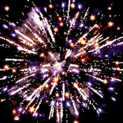 Множество золотых ниспадающих нитей и цветные звезды. Разноцветные сферы и облако золотого треска. Множество серебряных ниспадающих нитей и серебряные звезды с пышными хвостами. Облако треска.