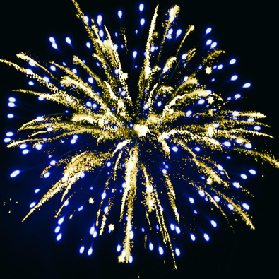 Разноцветные кометы разрываются сферами из золотых парчевых форсов с трещащими искрами на концах и цветных мерцающих огней. Множеством трещащих огней, сфер.