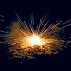 Вертится, разлетается трещащими искрами. Образует круг красного, зеленого и желтого огня.