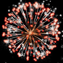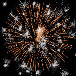 Разноцветные кометы, свистящие элементы разрываются сферами из золотых и серебряных форсов с цветными трещащими огнями на концах. Множества трещащих сфер. Веер. Серебряные форсовые трассы с цветнымии огнями на концах. Трещащие букеты, переходящие в сферы из серебряных форсов. Мерцающие букеты и золотые шуршащие трассы.