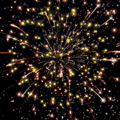 Разноцветные кометы и золотые искристые трассы разрываются сферами из золотых форсов с цветными мерцающими огнями на концах.