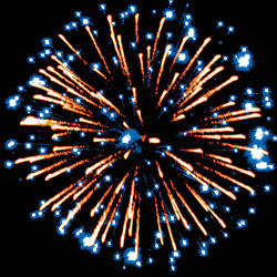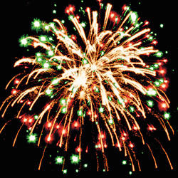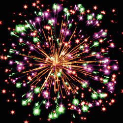 Разноцветные кометы разрываются сферами из золотых форсов с цветными огнями на концах и множеством трещащих сфер.