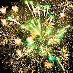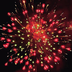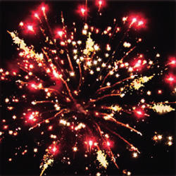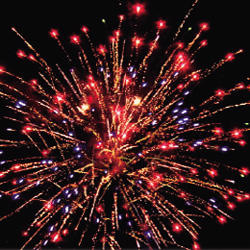 Красные мерцающие хвосты (мерцающая ива) и синие звезды. Золотые звезды с пышными золотыми хвостами (кокос) и зеленые звезды. Мерцающие золотые хвосты (мерцающая ива) и красные, зеленые звезды. Серебряные звезды с пышными хвостами (кокос) и красные звезды. Красочная концовка. ЗАЛП: Зелено-красная сфера (пион) и облако треска (трещащий дождь).