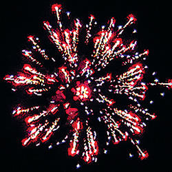 Разноцветные кометы разрываются сферами из: красных, зеленых и синих огней; золотых форсов с зелеными огнями на концах и серебряных мерцающих огней; золотых форсов с красными огнями на концах и синих огней; золотых искристых форсов и зеленых мерцающих огней.