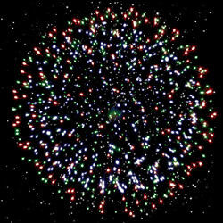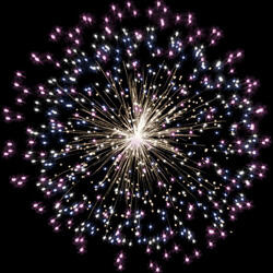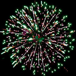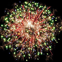 Разноцветные кометы разрываются сферами из цветных мерцающих огней, форсов с серебряными трещащими искрами и множеством трещащих сфер.
