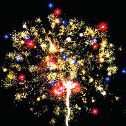 Красно-синяя сфера (пион) и белое мерцание. Трещащая комета разрывается красно-синей сферой (пион) и облаком треска (трещащая хризантема). Сине-фиолетовая сфера (пион) и белое мерцание. Трещащая комета разрывается зелено-фиолетовой сферой (пион) и облаком треска (трещащая хризантема). Желто-фиолетовая сфера (пион) и белое мерцание. Красная сфера (пион) и облако треска (трещащая хризантема).