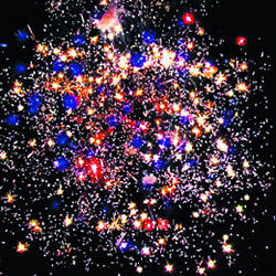 Множество серебряных ниспадающих нитей (парча) и красное мерцание. Зелено-синие звезды и треск. Мерцающие золотые хвосты (мерцающая ива) и фиолетовые звезды. Множество серебряных ниспадающих нитей (парча) и зеленые звезды. Разрыв шуршащими хвостами (снежные хлопья) и белая мерцающая сфера (пион).