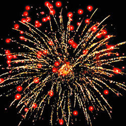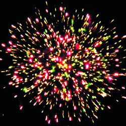Разрыв красными звездами с пышными хвостами (кокос) и белое мерцание. Разрыв зелеными звездами с пышными хвостами (кокос) с треском. Фиолетово-зеленое мерцание (пион). Красно-синий сферический разрыв (пион) и облако трещащих разрывов (трещащий дождь). Красочная концовка: Множество серебряных ниспадающих нитей (парча) и красное мерцание.