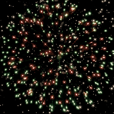 Разноцветные кометы разрываются сферами из серебряных мерцающих огней, форсов с цветными огнями на концах.