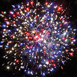 Разноцветная мерцающая сфера. Цветные звезды с пышными хвостами и облако треска. Разрыв трещащими хвостами.