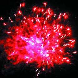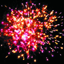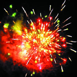 Красно-зеленая сфера (пион) с переходом в белые хвосты (кокос). Желто-фиолетовая сфера (пион) с переходом в белые хвосты (кокос). Красная сфера (пион) с переходом в белые хвосты (кокос) и треск. Зелено-красно-синяя сфера (пион) и белое мерцание. Фиолетово-желтая сфера (пион) и треск. Красно-зелено-синяя сфера (пион) и треск. Красно-зеленая сфера (пион) с переходом в белые хвосты (кокос). Красочная концовка. Звезды с пышными золотыми хвостами (кокос) и белое мерцание.