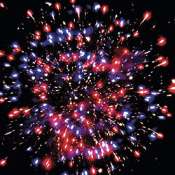 Залп хаотично разлетающихся огней. Множество золотых и серебряных ниспадающих нитей. Цветное мерцание. Разноцветные звезды с пышными хвостами. Облако треска.