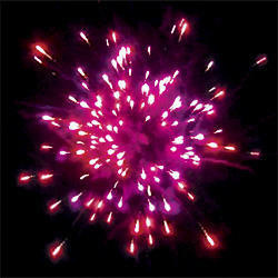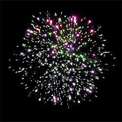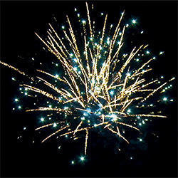 Разноцветные кометы разрываются сферами из золотых и серебряных форсов с цветными мерцающими огнями.