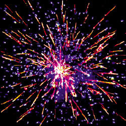 Красные звезды с пышными хвостами (кокос), золотое мерцание и фиолетовые звезды. Красно-белое мерцание и трещащие разрывы (трещащий дождь). Белое мерцание и трещащие разрывы (трещащий дождь). Золотое мерцание и красное мерцание. Красочная концовка: Множество серебряных ниспадающих нитей (парча) и синие звезды.