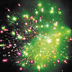 Зелено-белая мерцающая сфера (пион). Красные звезды с пышными хвостами (кокос) и треск. Фиолетово-зелено-белая мерцающая сфера (пион). Множество серебряных ниспадающих нитей (парча) и синие звезды.