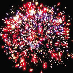 Множество серебряных ниспадающих нитей (парча) с красными и зелеными звездами на концах и треск. Разрыв шуршащими хвостами (снежные хлопья) и красным мерцанием. Красные и зеленые звезды с пышными хвостами (кокос) и облако треска (трещащий дождь). Красно-сине-белая мерцающая сфера (пион). Красочная концовка. ЗАЛП: Трещащие золотые хвосты (трещащая ива) и красное мерцание.