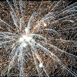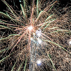 Разноцветные кометы разрываются множеством трещащих сфер и сферами из цветных огней.