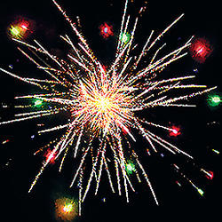Разноцветные кометы разрываются сферами из: трещащих огней, серебряных форсов с красными и зелеными огнями на концах; золотых форсов, синих и фиолетовых огней; золотых форсов и зеленых мерцающих огней; серебряных форсов с серебряными трещащими искрами, красных, синих и зеленых огней; серебряных форсов с серебряными трещащими искрами и серебряных мерцающих огней; золотых форсов с красными и зелеными огнями на концах; золотых форсов с красными мерцающими, зелеными мерцающими, серебряными мерцающими и трещащими искрами.