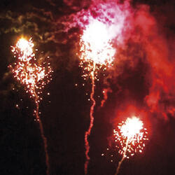 Серебряные звезды с пышными трещащими хвостами и разноцветные огни. Веер: цветные кометы переходят в трещащий разрыв.