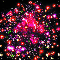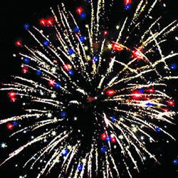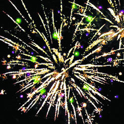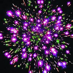 Красно-синяя сфера (пион) и белое мерцание. Веер V-формы: Комета разрывается множеством серебряных ниспадающих нитей (парча), красно-синей сферой (пион) и мерцанием. Веер V формы: Комета разрывается зелено-фиолетовой сферой (пион), множеством серебряных ниспадающих нитей (парча) и облаком трещащих разрывов (трещащий дождь). Зелено-фиолетовая сфера (пион) и облако трещащих разрывов (трещащая хризантема). Зелено-розовая мерцающая сфера (пион) и облако трещащих разрывов (трещащий дождь).