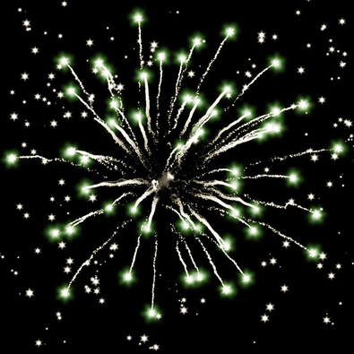Разноцветные кометы разрываются сферами из серебряных форсов с цветными мерцающими огнями и множеством трещащих сфер.