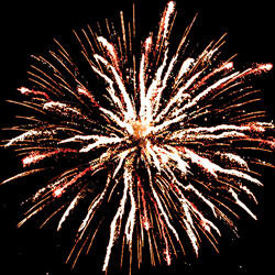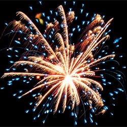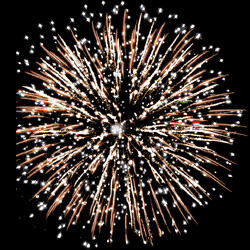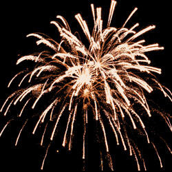Разноцветные кометы разрываются сферами из золотых и серебряных форсов с цветными мерцающими огнями и с трещащими искрами на конца.
