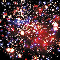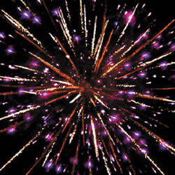 Разноцветные сферы и облако треска. Множество золотых и серебряных ниспадающих нитей и цветные звезды.Трещащая комета разрывается серебряными звездами с пышными трещащими хвостами и мерцанием.