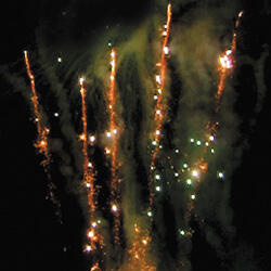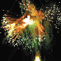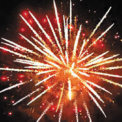 Трещащая комета разрывается множеством золотых ниспадающих нитей и цветным мерцанием. Веер.Разрыв золотыми букетами. Множество золотых ниспадающих нитей и треск. Золотые звезды с пышными хвостами.