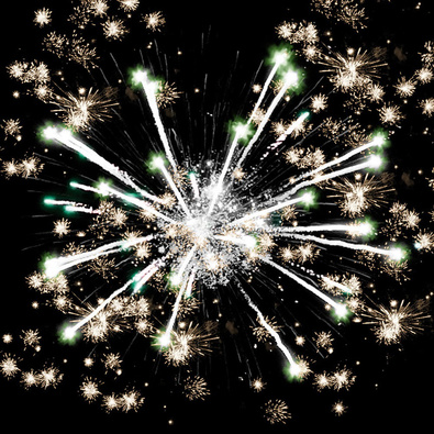 Разноцветные кометы разрываются сферами из золотых искристых форсов, цветных мерцающих огней и множеством трещащих сфер.