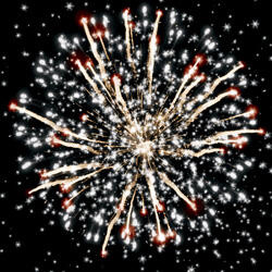 Свистящие элементы, разноцветные кометы разрываются сферами из золотых форсов с цветными огнями на концах, множества разлетающихся трещащих искр и золотых трещащих огней.