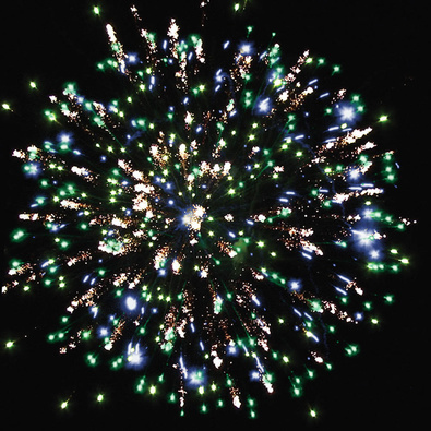 Разноцветные кометы разрываются сферами из серебряных форсов, крупных цветных мерцающих огней с серебряными трещащими искрами.