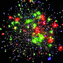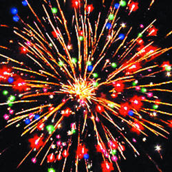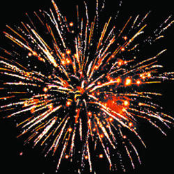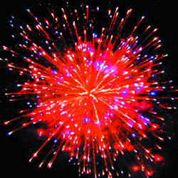 Красные звезды с пышными хвостами (кокос) и облако трещащих разрывов (трещащая хризантема). Сфера золотых хвостов с переходом в красно-синие звезды (цветная хризантема). Красно-зелено-синяя сфера (пион) и облако трещащих разрывов (трещащая хризантема). Множество золотых ниспадающих нитей (парча) и золотое мерцание. Множество золотых ниспадающих нитей (парча) с красными звездами на концах и зеленое мерцание. Красочная концовка: Красно-желто-зелено-фиолетовые шуршащие разлетающиеся кометы (паучки).